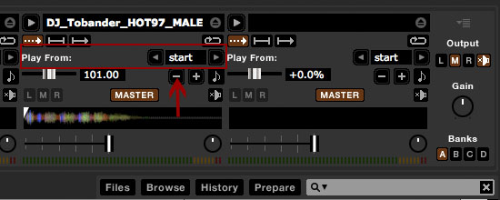 Es ist unter jedem Slot ein Pitch-Slider, eine BPM-Anzeige und eine Keylock-Funktion zu sehen. Mit dem Slider kannst du die Geschwindigkeit direkt anpassen (bei gedrückter Shift-Taste reagiert er sensibler). ACHTUNG: Die BPM werden nur angezeigt, wenn du dein Sample oder Track auch beatmapped hast. Andernfalls bleibt die Anzeige leer.