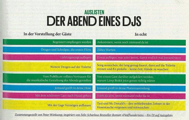 Animateur, DJ, Barkeeper, das sind alles Jobs, die meist ein klein wenig anders wahrgenommen werden, als es in Wirklichkeit ist, denn die ist meist ernüchternd. Nicht nur, dass wir – jedenfalls die meisten von uns – nicht jeden Abend eine andere Tussi mit nach Hause nehmen, nein, viel schlimmer. Manchmal müssen wir sogar Musik spielen, die uns nicht mal gefällt.